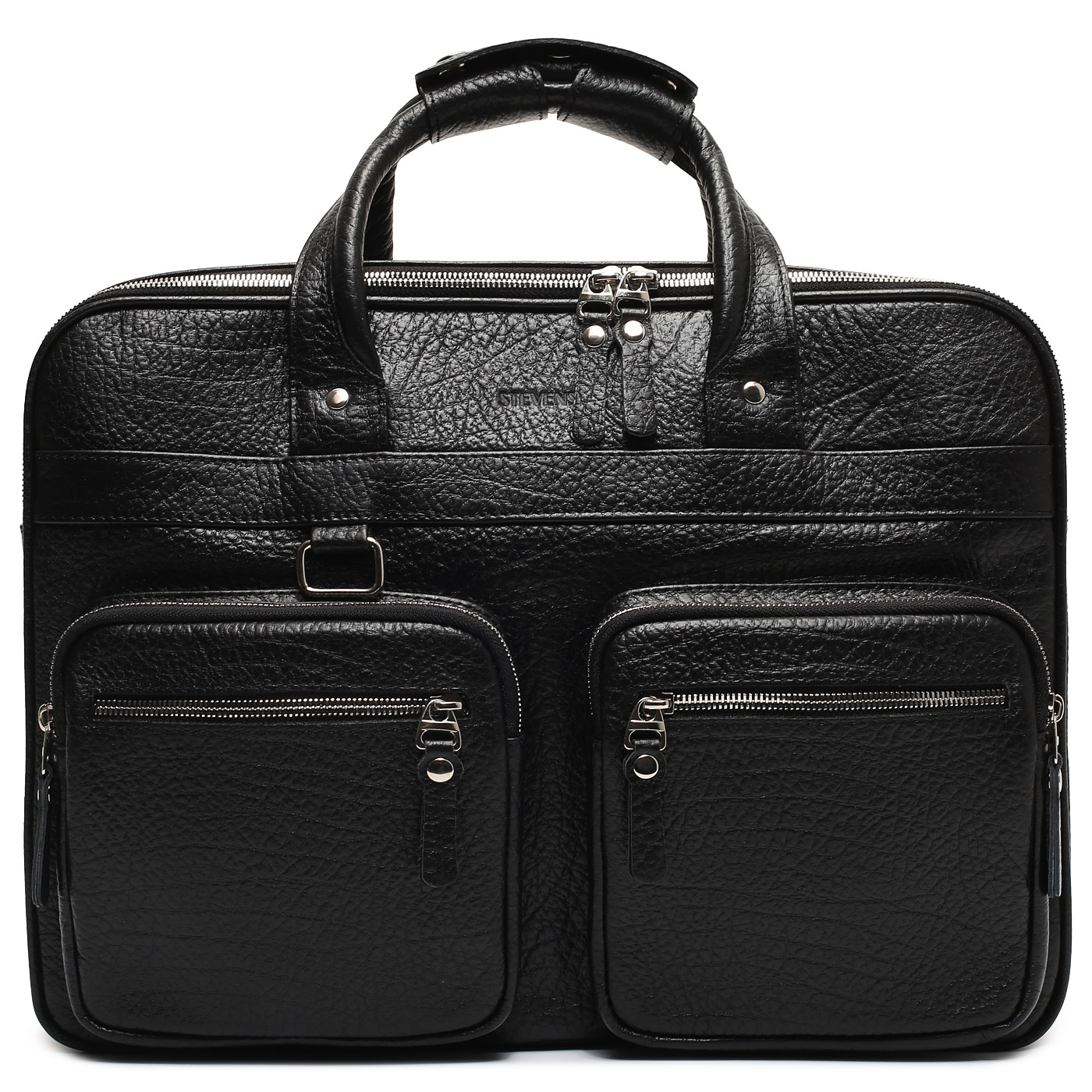 Чрезвычайно удобный вариант для командировок и различных бизнес-поездок — эргономичная деловая сумка повышенной вместительности. Черная модель из натуральной кожи делится на два отдела с двойной застежкой-молнией. В ближнем отделе — карман с фиксатором для ноутбука, набор слотов для карточек и держатели для ручек, в дальнем — карман с фиксатором для планшета, открытый карман и карман на молнии. Пять карманов на молнии размещены снаружи: четыре на передней и один на задней стенке. Верхние ручки и съемный регулируемый ремень для плеча позволяют носить сумку любым удобным способом.